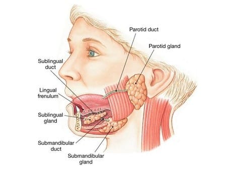 - Submandibular Glands – lie under the jawbone, one on each side. They release saliva into the mouth through a duct (tube) that opens in the floor of the mouth, under the tip of the tongue.
