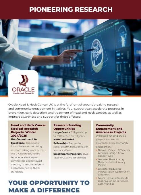 Leaflet describing how Oracle HNCUK is at the forefront of ground breaking research and community engagement initiatives. Your support can accelerate progress in prevention, early detection, and treatment of head and neck cancers, as well as improve awareness and support for those affected.