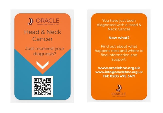 These “business card” sized cards give website and contact details for Oracle Head & Neck Cancer UK. The cards are designed for use by Healthcare Professionals to provide help to patients and carers.