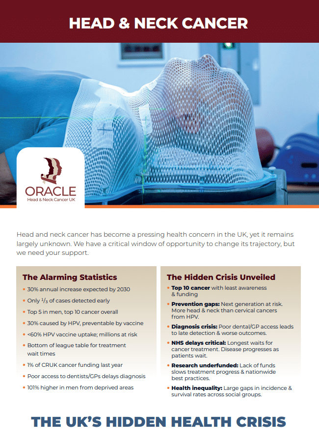 This leaflet explains how Head and Neck cancer has become a pressing health concern in the UK and yet it remains largely unknown. We have a critical window of opportunity to change its trajectory, but we need your support.