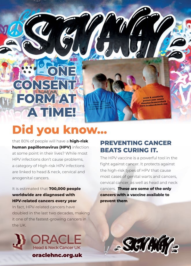 This leaflet support Oracle HNCUK´s campaign to raise awareness of the HPV vaccination programme for 12 to 25 year olds and reduce cancer incidences by 100,000 by 2058.